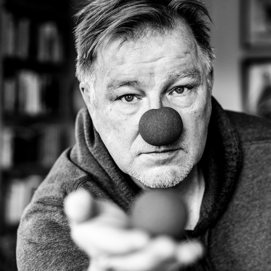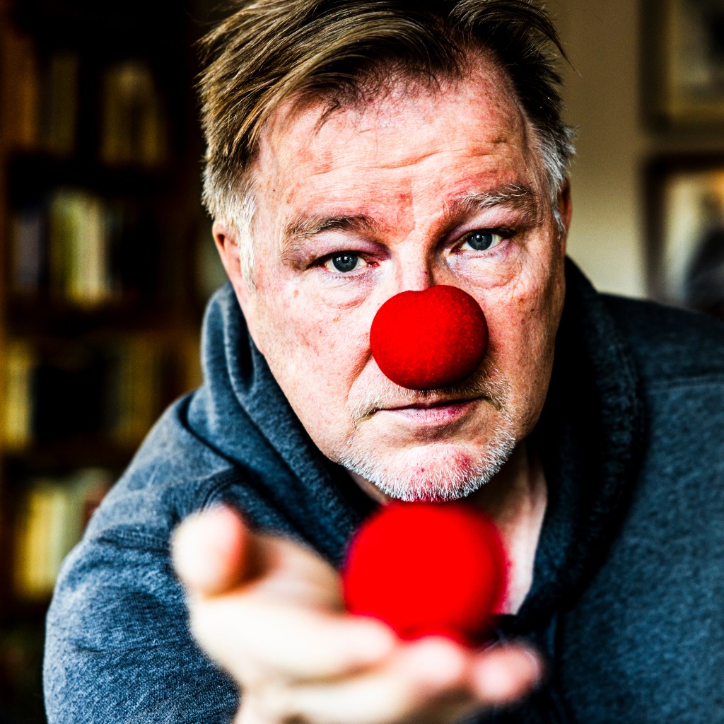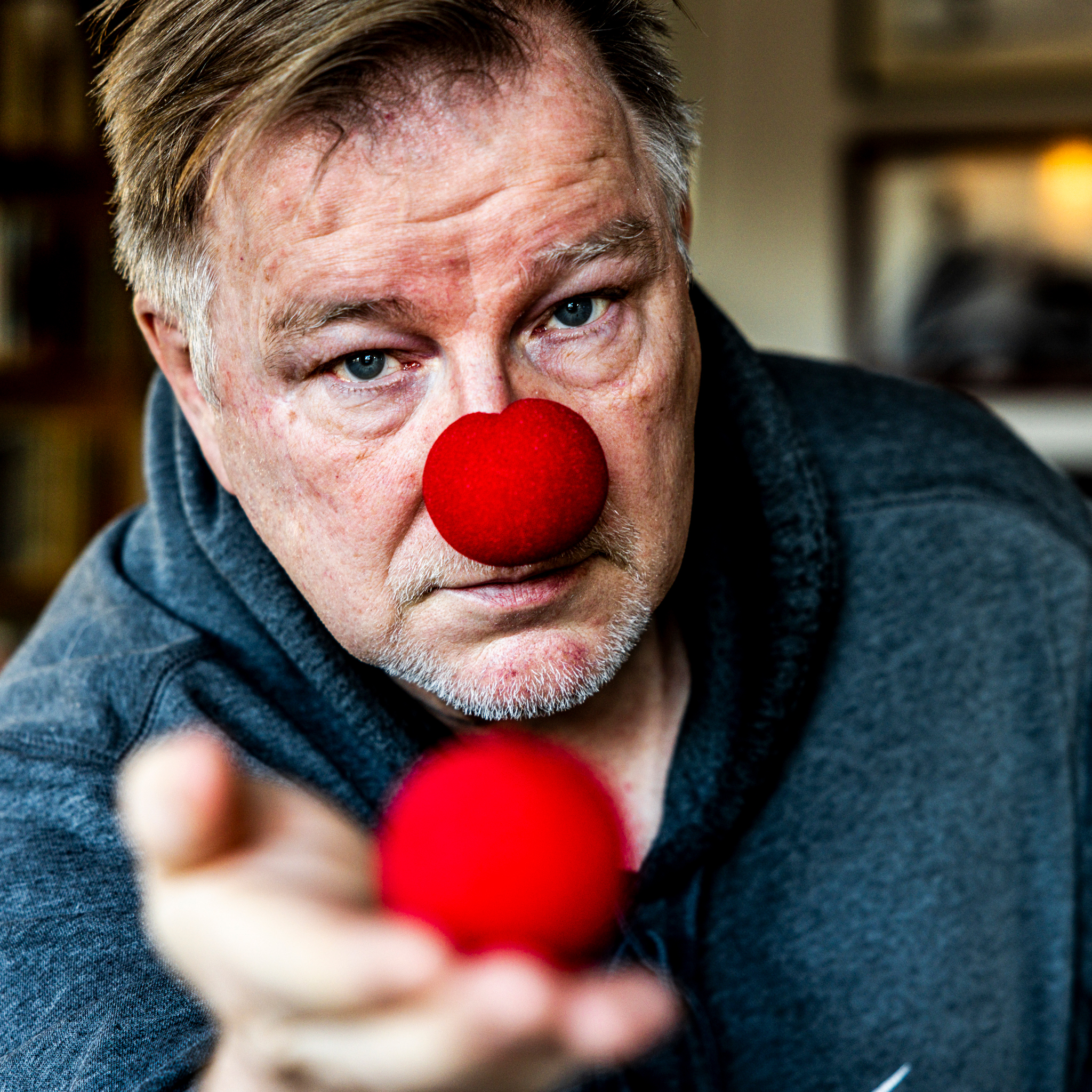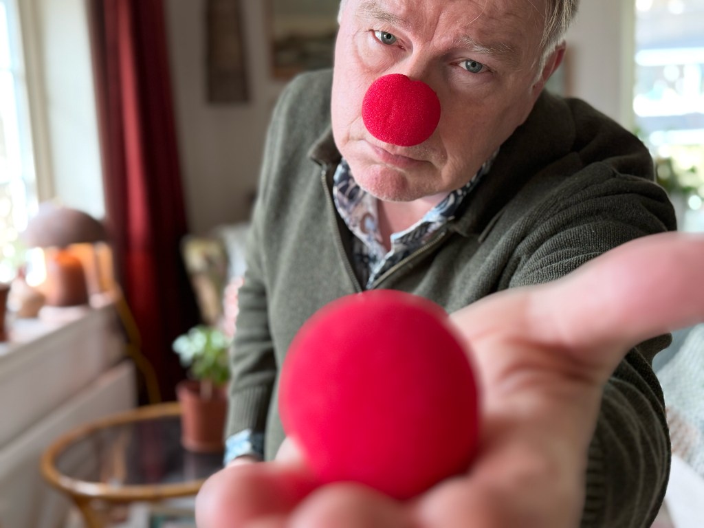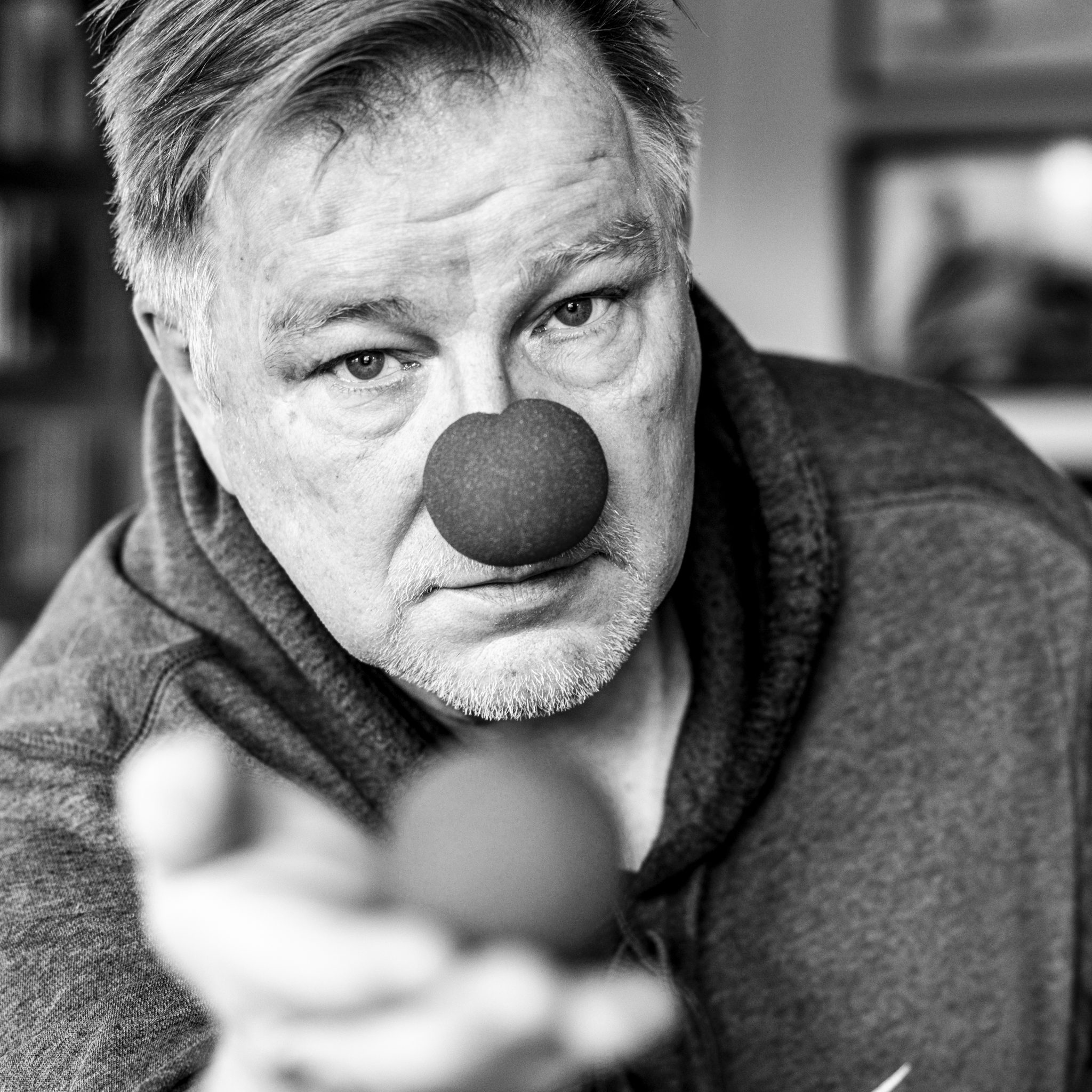 So first, I took a reference picture, with my cell phone. Then I staged the scene, using tripod and the available light. Short depth of field and my clown attribute. Took many pics, the final one is the what I submitted